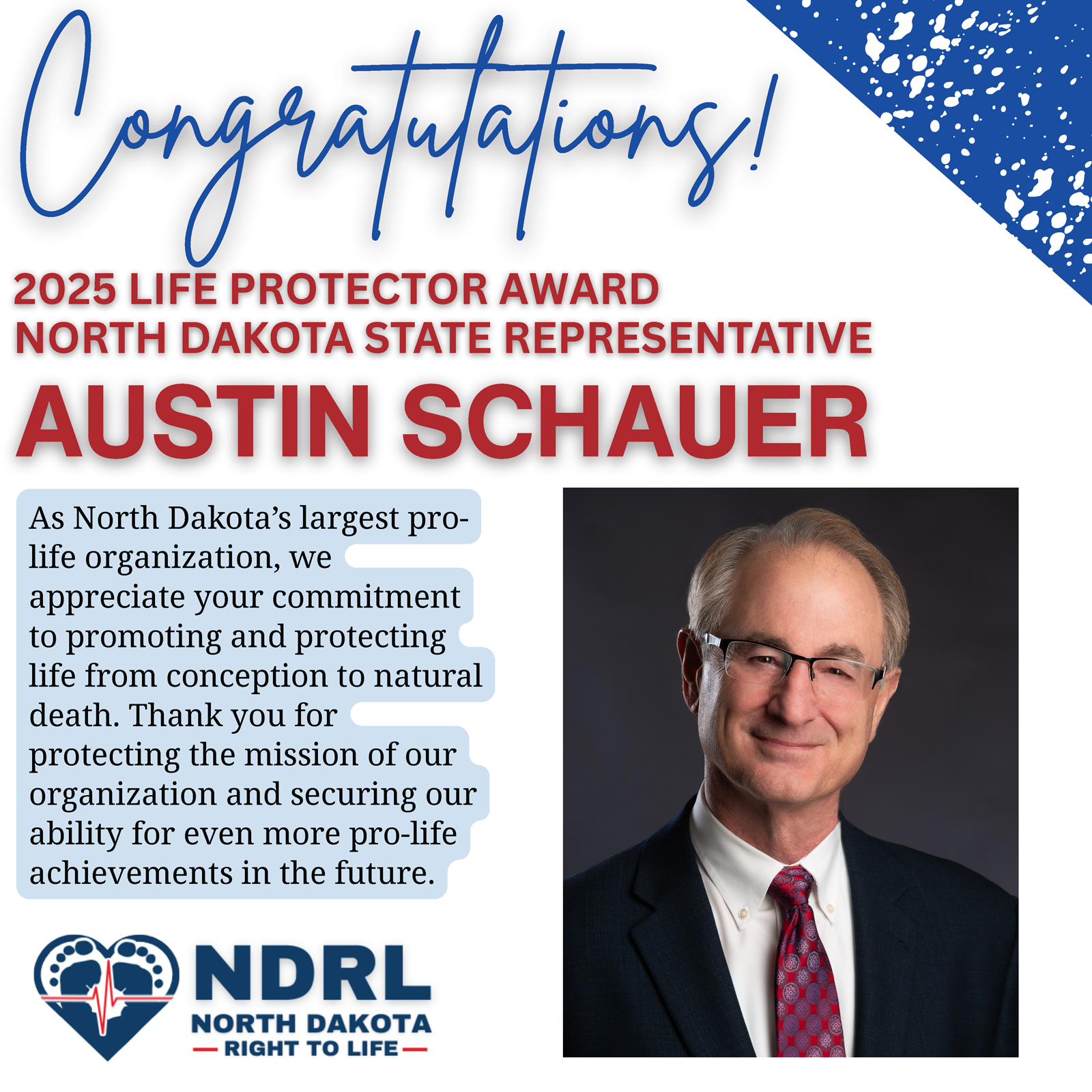 Representative Austen Schauer was awarded the Life Protector Award by the North Dakota Right to Life for his strong commitment to protecting life in our state and defending the most vulnerable.